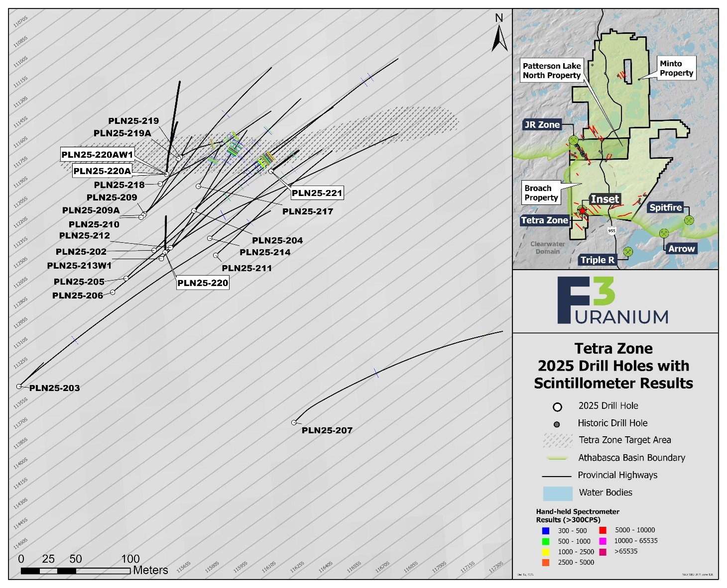 Kelowna, British Columbia--(Newsfile Corp. - January 13, 2026) - F3 Uranium Corp (TSXV: FUU) (OTCQB: FUUFF) ("F3" or "the Company") is pleased to announce final scintillometer results from its 2025 fall drill program on the Tetra Zone on the Broach Property. The program consisted of five diamond drill holes totaling 2,628m and extended the interpreted mineralized plunge length from 60m to 135m, an increase of 125%.