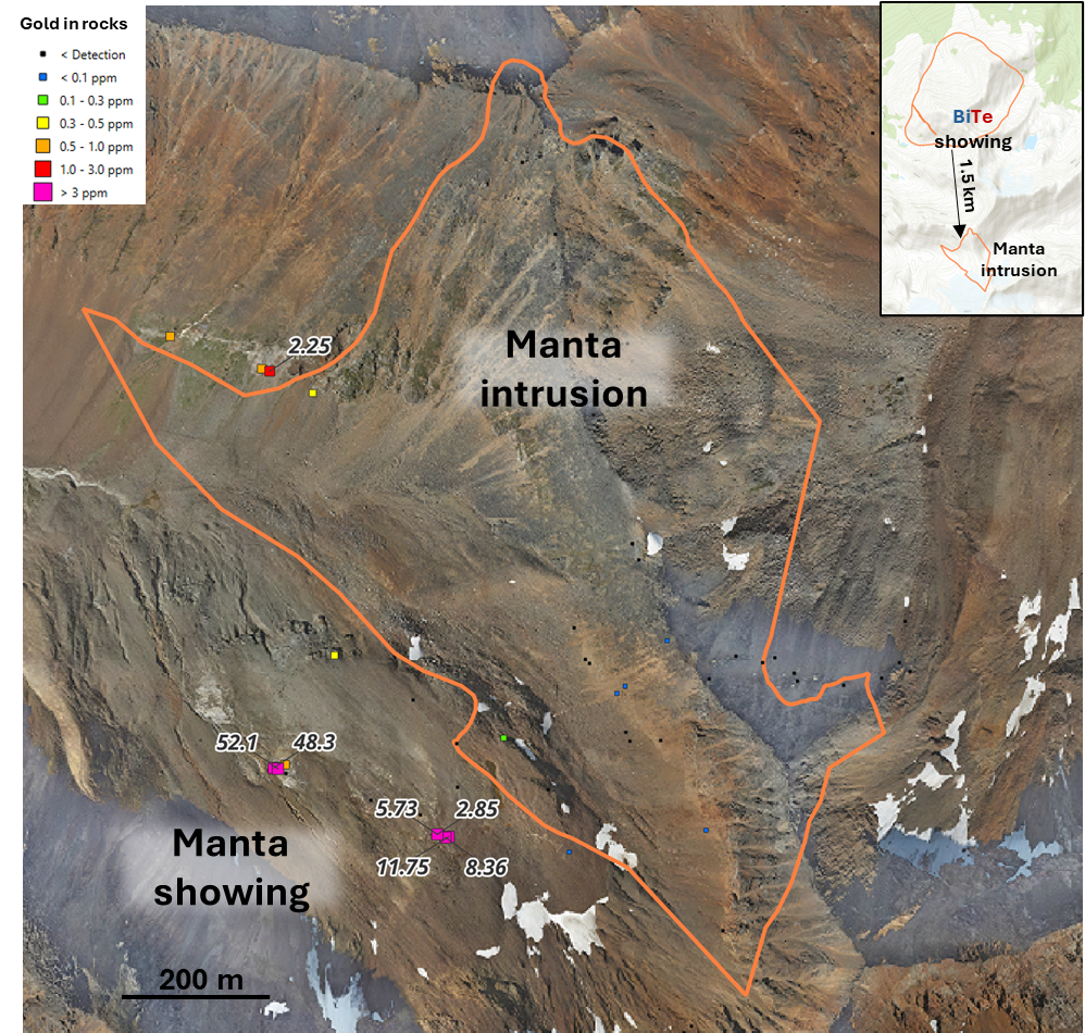 The Company is also awaiting results from a trenching program at a new discovery located 1.5 kilometers south of the BiTe discovery zone and hosted in the hornfelsed sediments on the margin of a previously unmapped Cretaceous intrusion. The intrusion has been named the Manta Intrusion and the showing is the Manta Showing. In 2025, the Company conducted prospecting and talus-fine sampling around the intrusion. The talus-fine sampling returned gold values up to 0.56 ppm with associated bismuth, tellurium and arsenic. Rock grab sample results from the western margin of the intrusion returned a number of samples greater than 1 ounce of gold per ton (31.1 g/t, Figure 1). The Company followed up in this area with trenching late in the season and these results are pending.