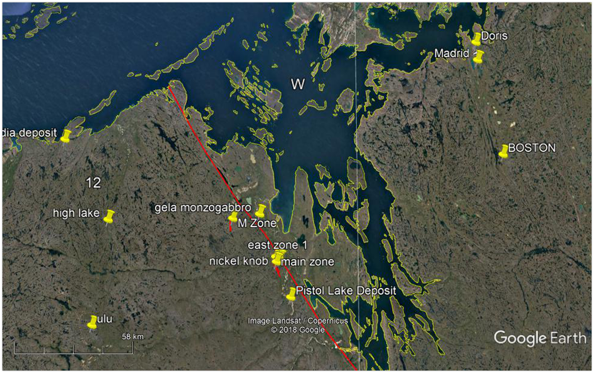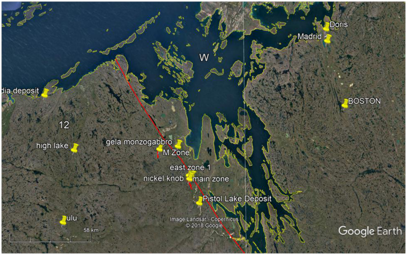 The West Gold claim is underlain by the same Archean amphibolite-facies geology that hosts mineralization at Turner Lake and lies near the 300 km-long regional Bathurst Fault, a major structural corridor favorable for gold deposition. The property is located 26 km north–northwest of Turner Lake and 10.6 km northwest of the Gela Lake project ( Figure 2 ).