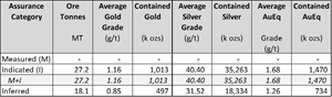 Note 1: Gold equivalent grades are calculated based on an assumed gold price of $US 1700 per ounce and silver price of $22 per ounce, based on the formula AuEq grade (gpt) = Au grade + Ag grade x ($22 / $1,700). Metallurgical recoveries are not considered in the in-situ grade estimate but are estimated to be 93% and 83% for gold and silver, respectively, when processed in a mill, and 72% and 25% respectively when heap-leached.