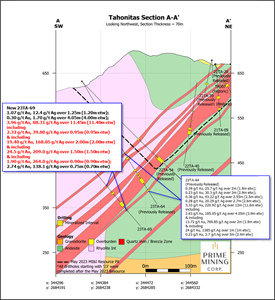 Two of the new core holes drilled at Tahonitas, in the southeast end of the Z-T Area (see Figures 1, 2), are located 100 to 200 metres below the recently announced resource pit shell. This drilling follows Prime’s news release of May 24, 2023 (link here), confirming the ongoing expansion of potential gold-silver resources in addition to and not included in the Company’s MRE.