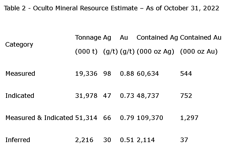 The most recent mineral resource estimate for the Oculto deposit is shown in an attached table.
