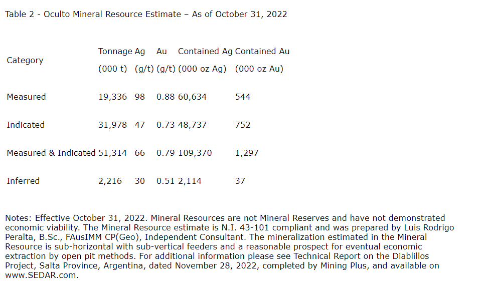 Diablillos property is located in the Argentine Puna region -- the southern extension of the Altiplano of southern Peru, Bolivia and northern Chile -- and was acquired from SSR Mining Inc. by the company in 2016. There are several known mineral zones on the Diablillos property, with the Oculto zone being the most advanced with over 120,000 metres drilled to date. Oculto is a high-sulphidation epithermal silver-gold deposit derived from remnant hot springs activity following Tertiarty-age local magmatic and volcanic activity. Comparatively nearby examples of high-sulphidation epithermal deposits include: Yanacocha (Peru); El Indio (Chile); Lagunas Nortes/Alto Chicama (Peru); Veladero (Argentina); and Filo del Sol (Argentina).