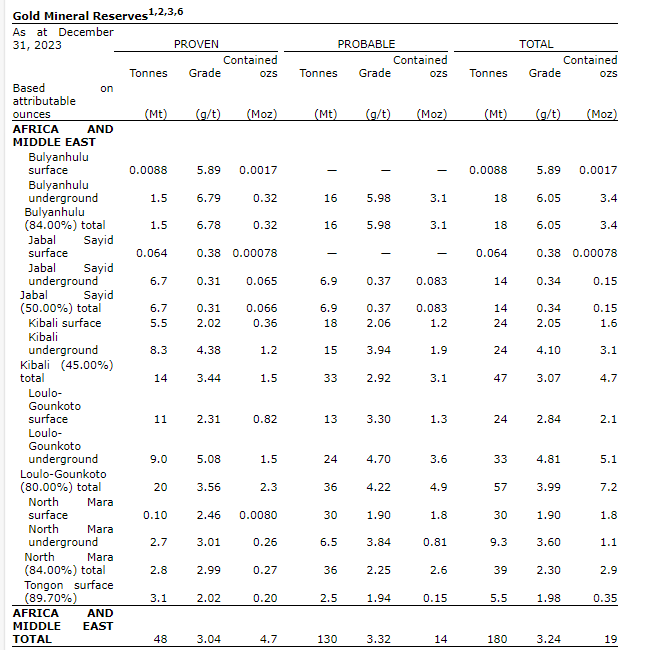 Attributable measured and indicated gold resources for 2023 stand at 180 million ounces at 1.06 g/t, with a further 39 million ounces at 0.8 g/t of inferred resources. Attributable measured and indicated copper resources for 2023 stand at 21 million tonnes of copper at 0.39 per cent, with a further 7.1 million tonnes of copper at 0.4 per cent of inferred resources. Mineral resources are reported inclusive of reserves and are based on a gold price of $1,700/oz and an updated copper price of $4/pound for 2023.
