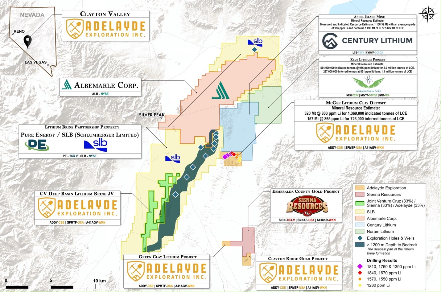 Vancouver, British Columbia--(Newsfile Corp. - January 28, 2026) - Adelayde Exploration Inc. (CSE: ADDY) (OTCID: SPMTF) (WKN: A41AGV) (the "Company" or "Adelayde") announces it has entered into a joint venture agreement ("JV") with Sienna Resources Inc. ("Sienna") and Cruz Battery Metals Corp. ("Cruz") to explore the deep basin lithium brine potential in Clayton Valley, Nevada. The 115 mineral claims comprising the 2,300-acre JV land package are all located within, and completely surrounded by, SLB's (formerly Schlumberger) and Pure Energy Minerals' Lithium Deposit (see map below). Clayton Valley, Nevada is the only long-established producing lithium brine basin in the U.S., home to Albemarle's Silver Peak lithium brine mine, which extracts lithium from subsurface brines. It has been the sole U.S. producing lithium brine operation since the 1960's.