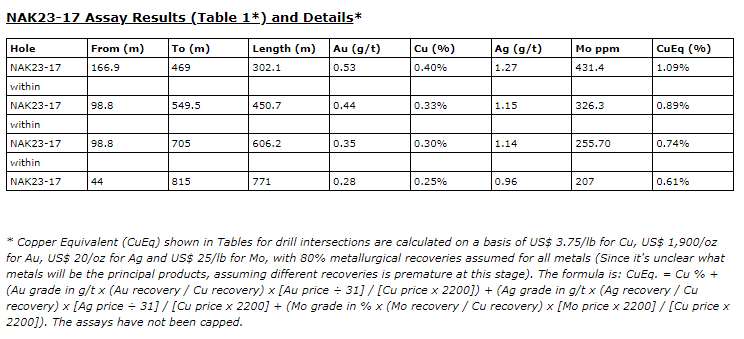 - Further define, expand and link the high-grade north and south mineralized zones (north: 530 metres of 0.61 per cent copper equivalent in drill hole NAK23-12; south: 302.1 metres of 1.09 per cent copper equivalent in drill hole NAK23-17 (see attached table);