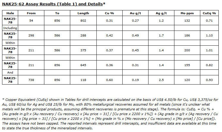 Drill hole NAK25-78 intersected 802 metres of 0.71 per cent copper equivalent (CuEq) from surface, including 375 metres of 1.01% CuEq beginning 211 metres downhole, confirming a broad, high-grade mineralized system with strong continuity across previously untested areas. The results increase the overall size of the South zone and successfully connect multiple high-grade discoveries made earlier in the 2025 drill season while demonstrating a significant expansion of the known highest-grade part of the system.