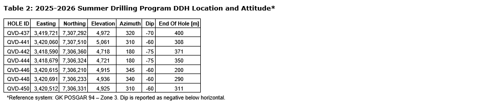 • Hole QVD-450: demonstrated broad mineralization with 134 g/t Ag over 18.0 m (from 181.0 m to 199.0 m), including higher-grade internal of 245 g/t Ag over 4.0 m (from 189.0 m to 193.0 m).