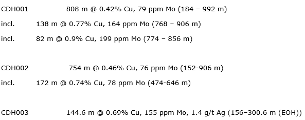 • CDH002: 754 m of 0.46 per cent Cu and 76 ppm Mo (152 to 906 m);