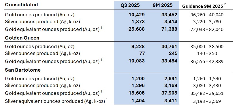 Alberto Morales, Executive Chairman and CEO, commented: "The Company's consolidated gold equivalent production increased from 24,341 oz in Q2 to 25,688 oz in Q3, driven by a strong increase in silver production at San Bartolome. Silver equivalent production at San Bartolome increased as forecast, from 1.092 million oz in Q2 to 1.404 million oz in Q3. At Golden Queen, the migration of fine ore particles impacted the permeability of a designated high-grade leach cell scheduled for processing. To resolve this challenge, the cell underwent reconditioning, and the leaching solution was administered at a reduced rate to mitigate further particle migration. The operations team utilized this situation to optimize ore blending protocols and adjust the strategy for applying the leaching solution. This delayed the timing of the leaching process, which resulted in gold equivalent production of 10,083 oz in Q3 versus 12,213 oz in Q2. We expect the Q3 production shortfall to be incremental to our future quarterly production. Golden Queen has returned to operating within expected parameters, with gold production increasing from late September through early October and showing a stabilizing trend.