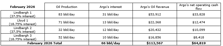Argo Gold Inc.'s February, 2026, oil production was 1,856 barrels, averaging 66 barrels per day. Oil prices averaged $61 per barrel, Argo's oil revenue was $113,567 and net operating cash flow was $64,819.
