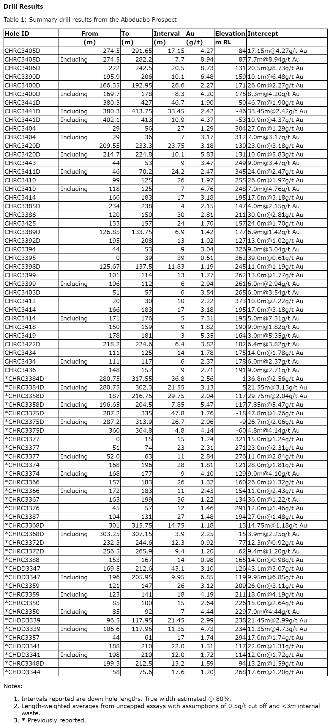 Dave Anthony, President and CEO stated, "Results from the exploration drill program at Aboduabo continue to support our assessment that the deposit remains open and has potential to develop into long life open pit mine and future underground mine. We look forward to expanding the Aboduabo footprint with our field mapping program."