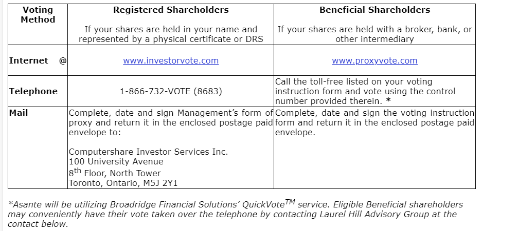 Asante's annual general meeting of shareholders will be held on Tuesday, April 23, 2024, at 10 a.m. (Toronto time), at 100 King St. West, suite 3400, Toronto, Ont., Canada, M5X 1A4, for the following purposes: