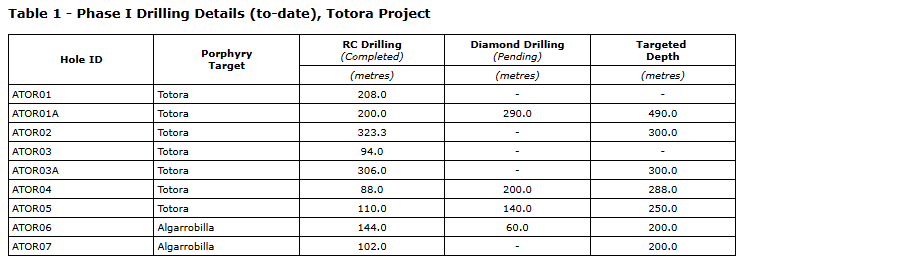 TOTORA CU/AU PROJECT REVERSE CIRCULATION DRILLING COMPLETED AND DIAMOND DRILL RIG BEING MOBILIZED