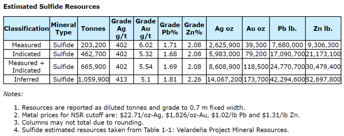 The discounted cash flows shown herein are prepared in compliance with National Instrument 43-101. There is no certainty that the economic results described herein will be realized. If the company is able to obtain sufficient capital and restart production at the Velardena properties, the company would do so without completing customary feasibility studies demonstrating the economic viability of the project. A mine production decision that is made without a feasibility study carries additional potential risks, which include, but are not limited to: (i) increased uncertainty as to projected initial and sustaining capital costs and operating costs, rates of production, and average grades; and (ii) the inclusion of inferred mineral resources, as defined by NI 43-101, that are considered too geologically speculative to have the economic considerations applied to them that would enable them to be converted to a mineral reserve, as defined by NI 43-101. Mine design and mining schedules, metallurgical flow sheets, and process plant designs may require additional detailed work and economic analysis and internal studies to ensure satisfactory operational conditions and decisions regarding future targeted production.