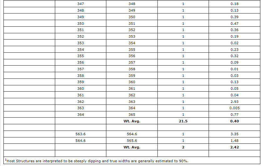 1. Highest-grade intercepts are within mafic (plus/minus ultramafic) breccia zone carapaces mantling the QFPs or highly deformed replacement-style structural zones (in the mafic volcanics) that are highly strained and completely replaced by ankerite, sericite and quartz.