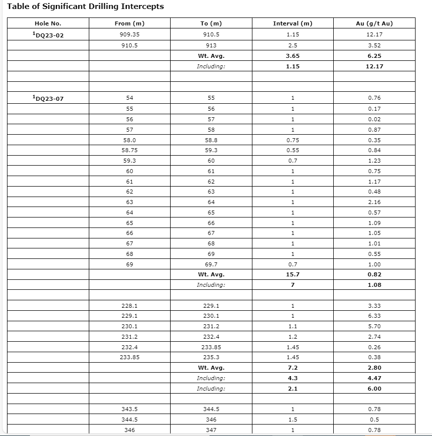 • DQ23-02 intersected 3.65 m of 6.25 g/t Au (including 1.2 m of 12.2 g/t Au). Expanded mineralization in footwall zone.