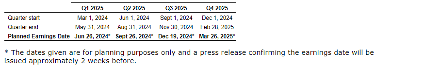 The attached table gives target dates for quarterly earnings announcements for fiscal year 2025.