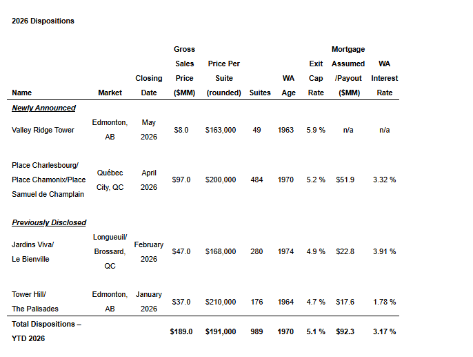 In addition to its own internally generated free cash flow, the trust continues to source incremental capital for redeployment through its disposition program. Subsequently to reporting its Q4 2025 financial results, the trust has finalized the sale of three additional communities in Quebec City (Place Charlesbourg, Place Chamonix and Place Samuel de Champlain) for combined gross sales proceeds of $97-million and one community in Edmonton (Valley Ridge Tower) for gross proceeds of $8-million. The Quebec City and Edmonton dispositions were sold to two separate purchasers. A full breakdown of the trust's disposition activity to date in 2026 is provided below.