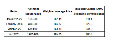 The trust continues to be active on its NCIB, capitalizing on the wide disconnect between its unit price, which has been trading well below the intrinsic value of the trust's portfolio, and real estate transactions in the private market. During the first quarter of 2026, the trust reinvested approximately $66-million into its NCIB.