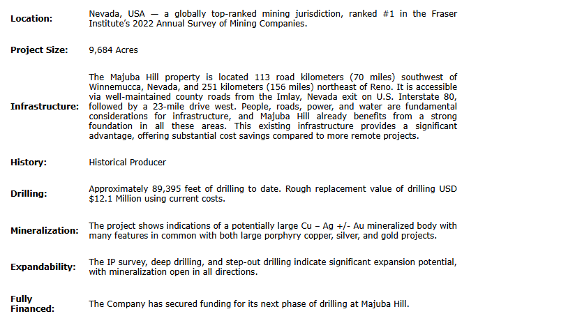 The company's flagship asset is the Majuba Hill copper, silver and gold district, located 156 miles (251 kilometres) from Reno, Nev. Majuba Hill benefits from a mining-friendly regulatory environment and strong local infrastructure. While still an exploration-stage asset, the geological footprint and scale of mineralization indicate that further work is clearly justified and that the system may host significant copper potential.