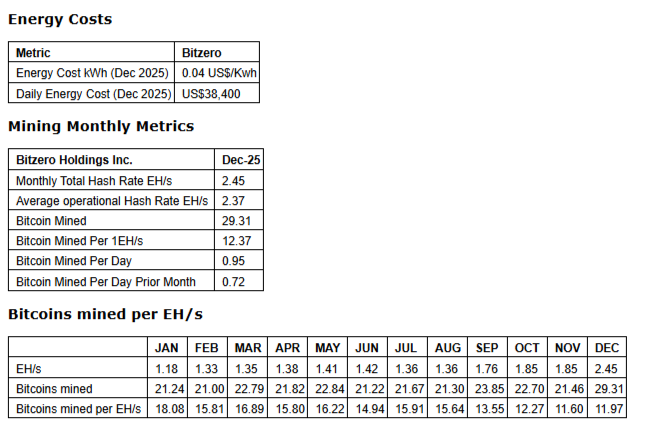Bitzero Holdings Inc. has provided an operational update of the company's self-mining operations.