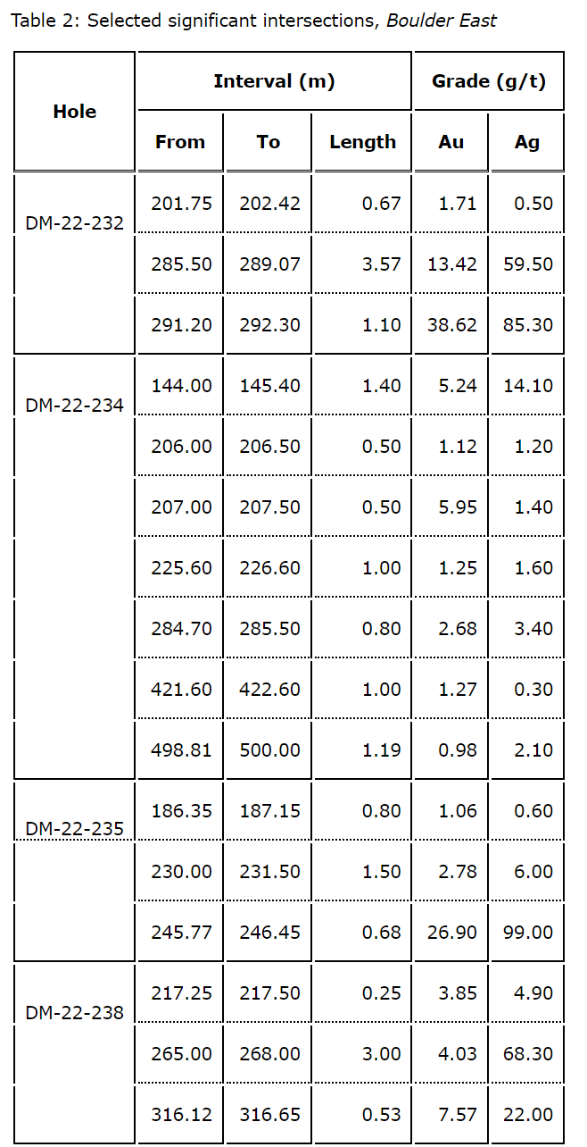 Drilling in this area was designed to follow up the high-grade vein intersection cut in drill hole DM-21-224. This hole, collared from the Chance structural area, was drilled back toward the Boulder East zone. Drill hole DM-21-224 intersected two significant gold-silver veins: