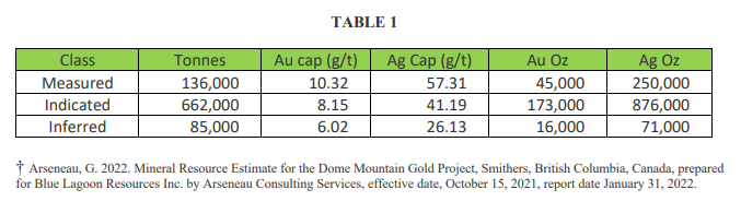 Table 1 shows the current 43-101 resource at Dome Mtn.