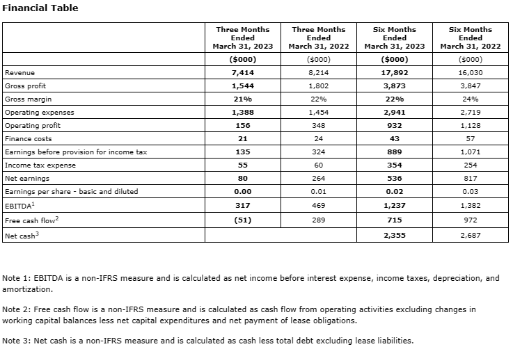 - Net cash (see definition below) as at March 31, 2023 was $2.4 million, compared to net cash of $2.7 million at March 31, 2022.