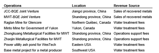 BQE Water's 20-per-cent share in MWT-BQE is with the company's 80-per-cent partner, Beijing MWT Water Treatment Project Ltd. Co., and together the companies operate a water treatment plant at a smelter in Shandong province of China. MWT-BQE generates revenues from the sale of zinc and copper recovered from smelter waste water. The operating results for the three and six months ended June 30, 2023, are provided in an attached table.
