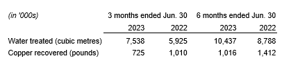 BQE Water's 50/50 joint venture with partner, Jiangxi Copper Company, operates three water treatment plants at the Dexing mine and at the Yinshan mine in Jiangxi province of China. The volume of water treated and pounds of copper recovered by the plants fluctuate seasonally depending on precipitation levels in the region. The operating results for the three and six months ended June 30, 2023, are provided in an attached table.
