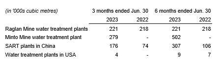 In Q2 2023, all three plants met mechanical availability and process performance targets set by the company. The volume of water treated increased by 27 per cent while the mass of copper recovered decreased by 28 per cent compared with Q2 2022. Changes in water volume and feed grade from period to period are largely the result of environmental conditions beyond the control of the joint venture.