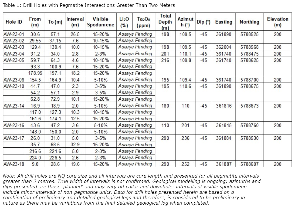 A total of 3,712 metres, representing 18 drill holes, were drilled at Anatacau West, targeting extensions of mineralized pegmatites found on Allkem's neighbouring claims. The drilling completed to date has successfully identified several spodumene-bearing pegmatites, two of which have a strike length of over 250 metres. Of the 18 drill holes, 17 drill holes intersected spodumene mineralization. All pegmatite intersections are above 200 metres depth; significant intercepts are listed herein, for which assays are pending.