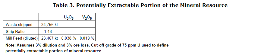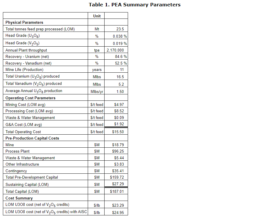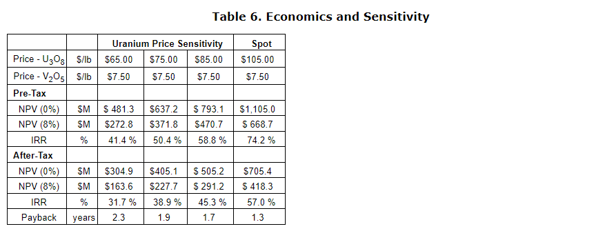 The economic results of the PEA are summarized in the table entitled "Economics and sensitivity," on both a before-tax and after-tax basis. For the PEA base case, a long-term uranium price of $75/lb U3O8 and a vanadium price of $7.50/lb V2O5 were used. Sensitivity to various uranium prices are shown in the table entitled "Economics and sensitivity," while the vanadium price is kept fixed.