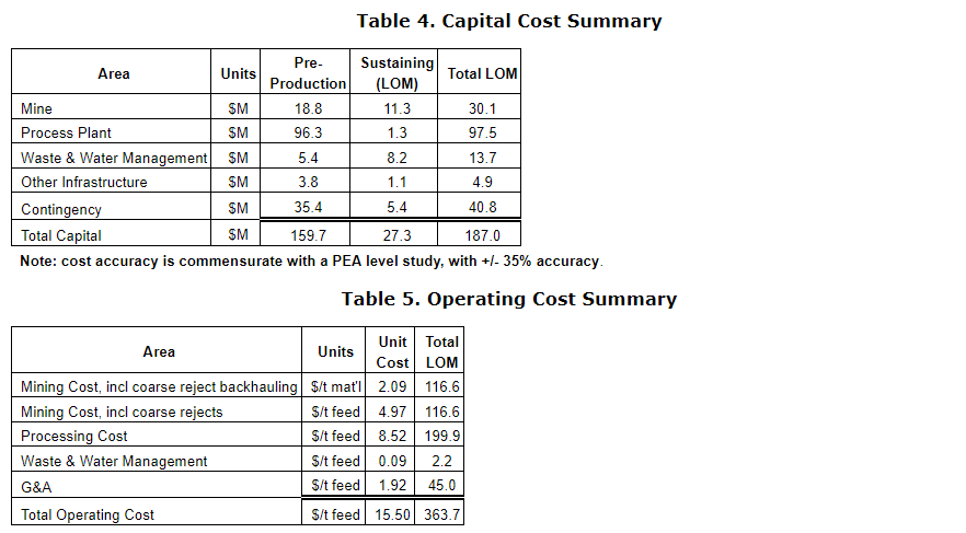The life-of-mine capital and operating costs are summarized in the tables entitled "Capital cost summary" and "Operating cost summary." The costs assume a fully owner-operated project. The closure and reclamation cost are estimated at $26.8-million, and includes costs for site remediation and final backfilling of the remaining mine excavation. These costs are commensurate with a PEA-level study and have an accuracy of plus/minus 35 per cent.