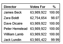 At the meeting, shareholders also approved the appointment of PricewaterhouseCoopers LLP as the auditor of the company for the ensuing year and the company's amended stock option plan was approved by disinterested shareholders.