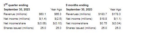 Revenue for the quarter was $60.1-million, down $5.2-million from the comparable quarter in the prior year. Revenue for the first nine months of 2023 was $183.7-million, up $5.4-million compared with the nine months ending Sept. 30, 2022. The company obtained higher sales as it resolved some of the supply chain problems encountered in the last three years.