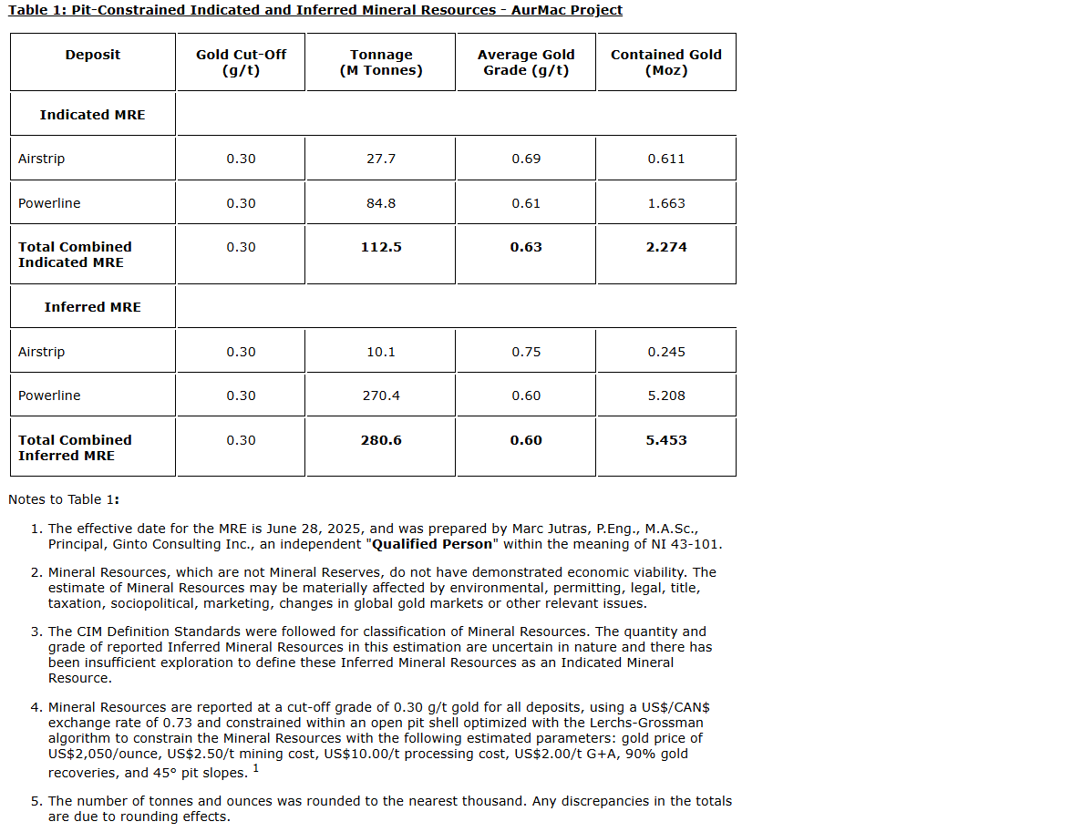 Approximately 80 per cent of the 2026 drill budget will be allocated to project advancement at Airstrip and Powerline which host an indicated mineral resource of 2,274,000 (M) ounces (oz) of gold (Au) (112.5 M tonnes at 0.63 gram per tonne) and an inferred mineral resource of 5.453 Moz of Au (280.6 M tonnes at 0.60 g/t) using a $2,050 (U.S.) gold price (as defined in the Canadian Institute of Mining Definition Standards for Mineral Resources & Mineral Reserves incorporated by reference into National Instrument 43-101; see news release dated Aug. 20, 2025). Diamond drilling will also test potential for expansion of the known mineralized system at both deposits along strike and down-dip of known mineralized domains.