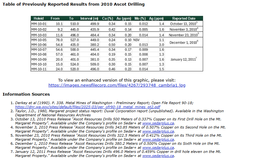 A historical resource estimate was completed by Duval for the Mt. Margaret deposit, with 577 Mt (million tonnes) grading 0.36 per cent Cu (copper), 0.24 gram per tonne Au (gold), 0.011 per cent Mo (molybdenum) and 1.58 g/t Ag (silver). This historic estimation work predates the implementation of National Instrument 43-101 -- Standards of Disclosure for Mineral Projects guidelines and was not classified based on currently accepted reserve and resource classifications as set forth by the Canadian Institute of Mining and Metallurgy, Aug. 20, 2000 (Canadian Institute of Mining guidelines), or the United States Securities and Exchange Commission's Regulation Subpart 1300 of Regulation S-K (S-K 1300). Cambria cautions it is not treating the historic Duval work as a current mineral resource estimate, and there has been insufficient work completed by a qualified person to do so at any point in the project's history. Furthermore, uncertainty regarding cut-off grade, metal prices, modelling methodology, or other parameters and assumptions used in the Duval work could impact the reliability of the historic estimation. Cambria still considers the Duval work relevant given the number of supporting historical drill holes, many of which were confirmed by subsequent Ascot drilling in 2010. Further work including additional infill drilling, geological modelling, and assay certificate and collar validation by a qualified person pursuant to National Instrument 43-101 would be required to produce a NI 43-101 or an S-K 1300-compliant resource. There are no guarantees that this additional work would confirm the historical resource estimate defined by Duval.