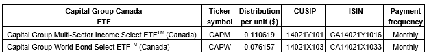 CAPITAL GROUP CANADA ANNOUNCES CASH DISTRIBUTION FOR CAPITAL GROUP CANADA ETFS (CAPM, CAPW)