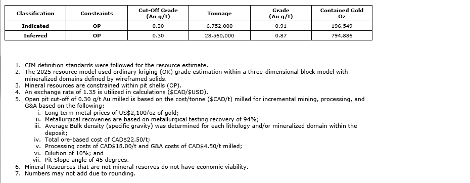 Destiny hosts an open-pit-constrained MRE completed in March, 2025, with the gold inventory detailed in the attached table.