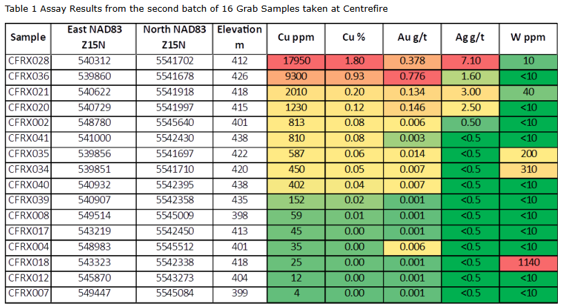 CASCADE COPPER ANNOUNCES ADDITIONAL RESULTS FROM FIELD WORK AT THE CENTREFIRE COPPER-GOLD PROJECT