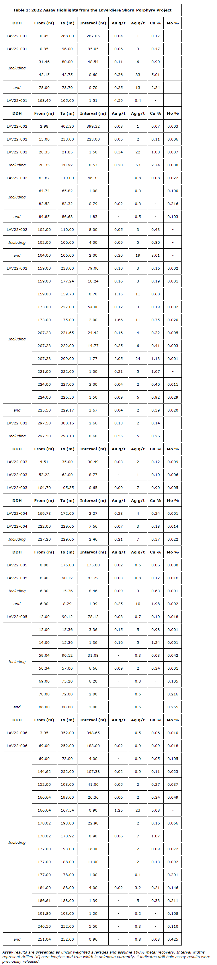Laverdiere Skarn-Porphyry Project 2022 Diamond Drilling Highlights