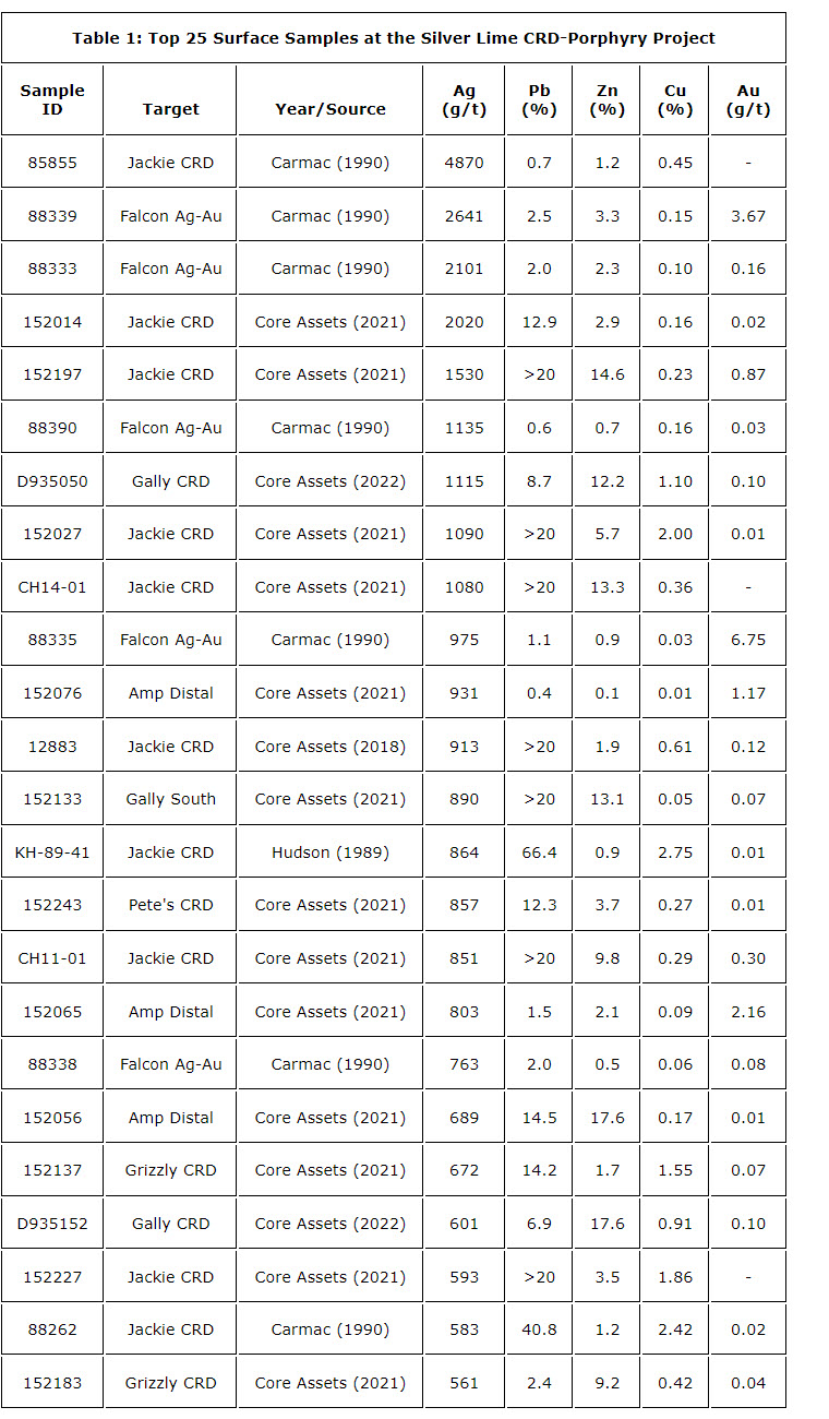 CORE ASSETS SUMMARIZES 2022 EXPLORATION WORK COMPLETED AT THE SILVER LIME PROJECT