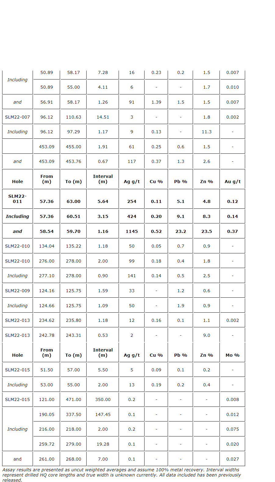 - Grizzly CRD target: SLM22-011 intersected 5.64 metres of 254 grams per tonne Ag, 5.1 per cent Pb, 4.8 per cent Zn, 0.11 per cent Cu and 0.12 g/t Au from 57.36 m core depth including 3.15 m of 424 g/t Ag, 9.1 per cent Pb, 8.3 per cent Zn, 0.20 per cent Cu and 0.14 g/t Au, extending the previously rushed carbonate replacement massive sulphide intercept which included 1.16 m of 1,145 g/t Ag, 23.2 per cent Pb, 23.5 per cent Zn, 0.52 per cent Cu and 0.37 g/t Ag from 58.54 m depth.