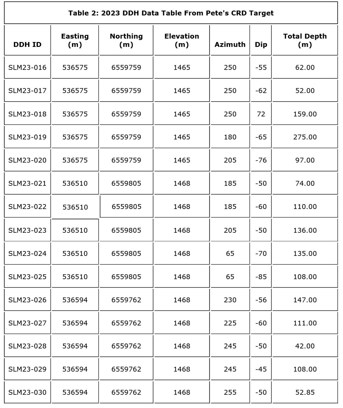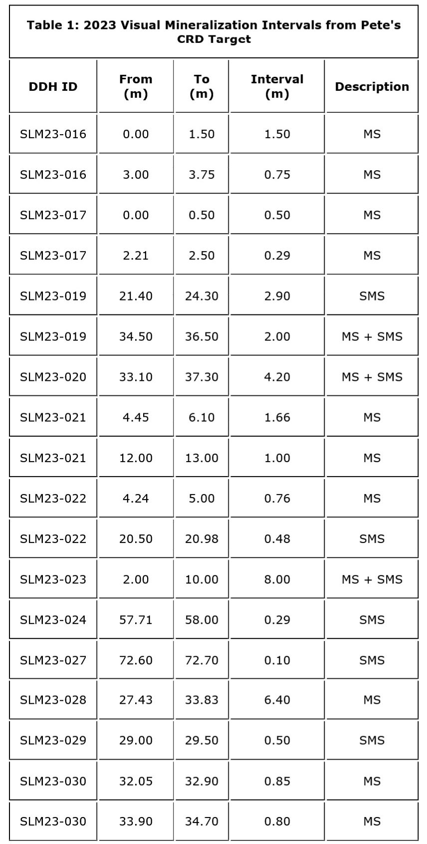HighlightsSLM23-028 intersected 6.40m of Zn-Fe-Pb-Agplus or minusCu-rich (visual) massive sulphide carbonate replacement mineralization and breccia from 27.43 meters depth. (Link to 3D Core Videos)SLM23-020 intersected 4.20m of massive-to-semi massive carbonate replacement and Skarn mineralization from 33.10m depth. (Figure 2)SLM23-030 intersected 0.80m of massive sulphide carbonate replacement mineralization from 32.05m depth. (Link to 3D Core Videos)SLM23-023 intersected 8.00m of Fe-Znplus or minusCu-Pb-rich (visual) massive-to-semi massive skarn and carbonate replacement mineralization from 2.00 meters depth, and brecciated CRM was encountered at 115.20m depth.Mineralization locally is texturally and mineralogically similar to what was observed in SLM22-011 completed at the Grizzly CRD Target in 2022. Hole SLM22-011 at the Grizzly Target returned 5.64m of 254g/t Ag, 5.1% Pb, 4.8% Zn, 0.11% Cu and 0.12g/t Au from 57.36m depth including 1.16m of 1,145g/t Ag, 23.2% Pb, 23.5% Zn, 0.52% Cu, and 0.37g/t Ag from 58.54m depth.The inferred trend of massive sulphide mineralization at Pete's CRD Target currently measures 100 meters in length - extending from surface to drilled depths of ~ 73 meters and remains open for exploration (Figure 1).