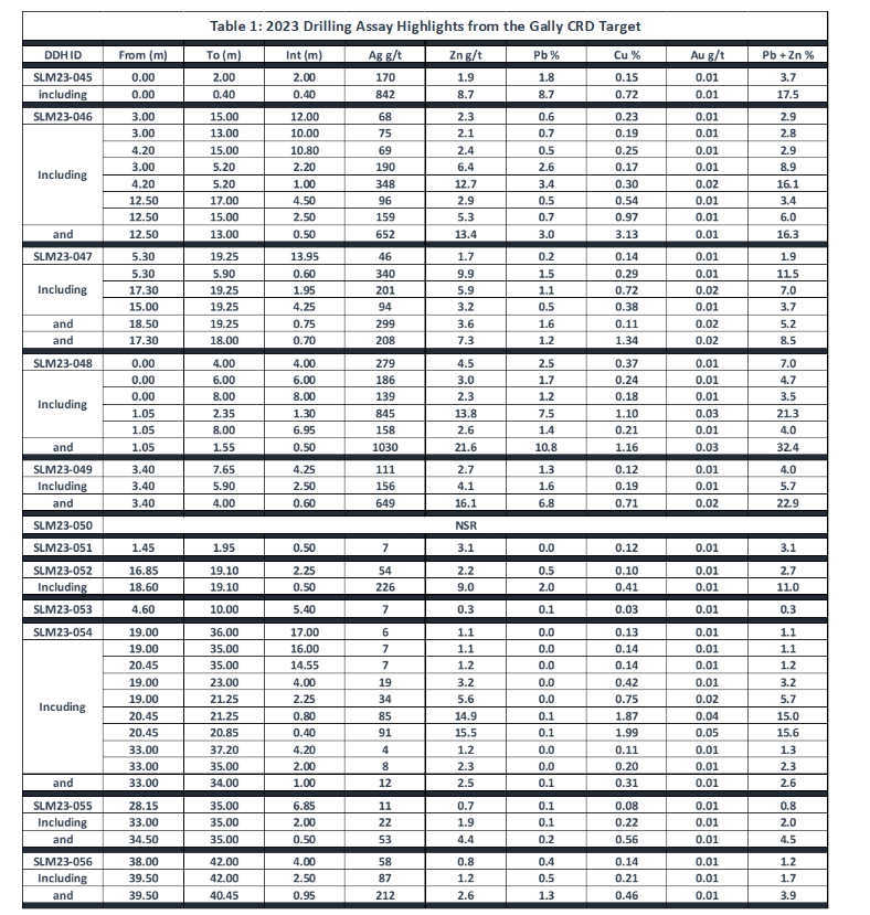 - SLM23-049 intersected 4.50 m of 111 g/t Ag, 4 per cent Pb plus Zn and 0.12 per cent Cu from 3.40 m depth, including 0.60 m of 649 g/t Ag, 22.9 per cent Pb plus Zn and 0.71 per cent Cu.