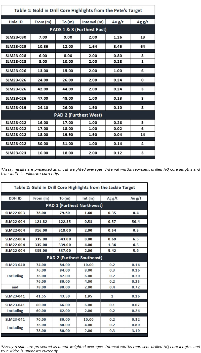 • SLM22-004 intersected 8m of 0.69 g/t Au and 6.5 g/t Ag including 2m of 5.42 g/t Au and 5.6 g/t Ag from 335m.SLM23-041 (and SLM23-040) intersected multiple Au-bearing zones including 2m of 3.10 g/t Au within 10m of 0.32 g/t Au from 70m.