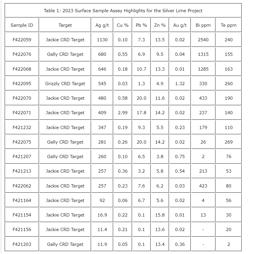 Currently, the Silver Lime project consists of seven highly prospective targets that span the complete mineralization spectrum from porphyry Mo-Cu to iron-Zn-Cu-Ag massive sulphide skarn (Sulphide City) and Ag-Pb-Zn-Cu-Au carbonate replacement mineralization (Gally, Pete's, Grizzly, Jackie), to distal, sediment-hosted Ag-Au-bearing quartz veining and Au-bearing base metal sulphide vein occurrences (Amp, Falcon). Prospecting and surface sampling in 2022 and 2023 more than doubled the number of exposed, high-grade carbonate replacement massive sulphide targets at Silver Lime that remain open in all directions and at depth.