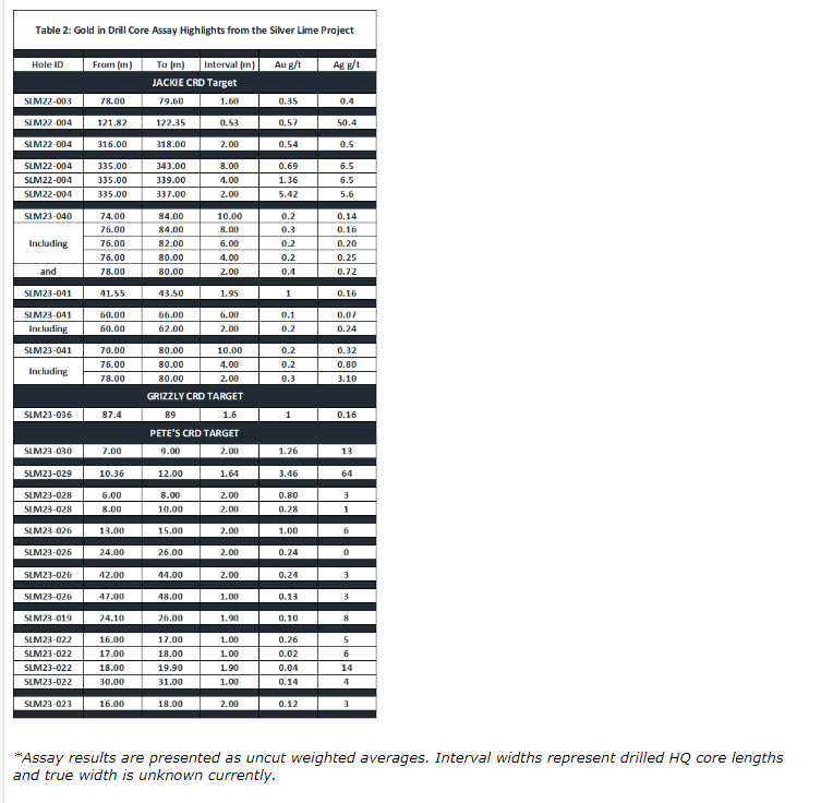 Some drill holes completed at Jackie intersected steep gold-bearing fugitive calcite veins that graded up to two m of 3.10 g/t Au within 10 m of 0.32 g/t gold between 40 m and 80 m drilled depths. Similar, near-surface gold-bearing veins were also intersected at the Pete's and Grizzly targets in 2023, significantly adding to the precious metal endowment of the Silver Lime project.